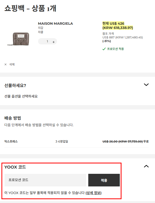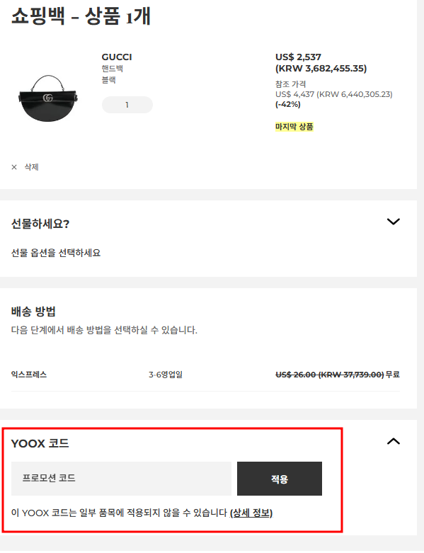 YOOX(육스) 결제 단계에서는 ‘프로모션 코드’ 입력란이 제공되며,